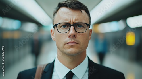 A focused businessman in a suit stands confidently in a modern setting, exuding professionalism and determination.