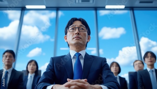 A focused businessman sits in front of a team against a backdrop of blue skies and clouds, symbolizing determination and leadership.