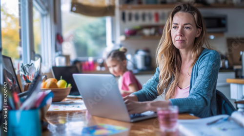 A focused Caucasian woman working on her laptop at home, with her young daughter studying in the background