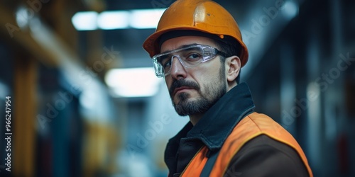 A focused construction worker in an orange safety vest and helmet stands in a busy industrial setting. His serious expression highlights responsibility and safety. Professional style. AI