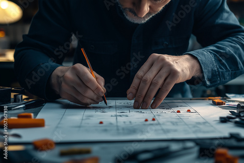 A focused creator is seen adjusting light while sketching on paper, surrounded by tools and materials. atmosphere conveys creativity and dedication