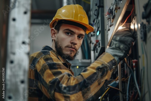 A focused electrician repairing a complex electrical panel in an industrial setting
