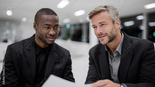 A focused exchange between two businessmen in a modern office, emphasizing collaboration, strategy, and relationship-building in a corporate environment.