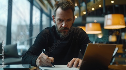 A focused freelancer writes notes at a coffee table, surrounded by a warm, cozy atmosphere with soft lighting and modern decor.