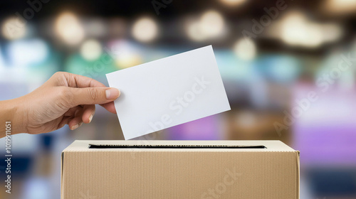 A focused hand places a voting ballot into a ballot box, symbolizing civic duty and participation in democracy, set against a blurred background that emphasizes the importance of the act