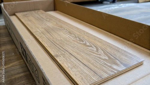 A focused image capturing the textured surface of a single laminate plank peeking from a slightly od box with delicate wood grain patterns emphasizing the craftsmanship.