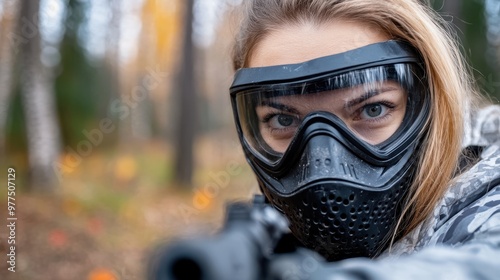 A focused individual aims a paintball gun wearing protective goggles in an autumn forest. The image emphasizes concentration, safety, and energetic outdoor recreational activity.