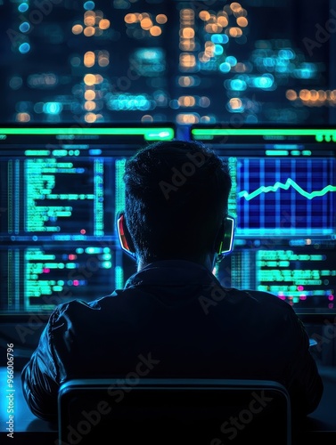 A focused individual analyzes data on multiple screens, surrounded by a vibrant cityscape glowing at night, representing modern technology.