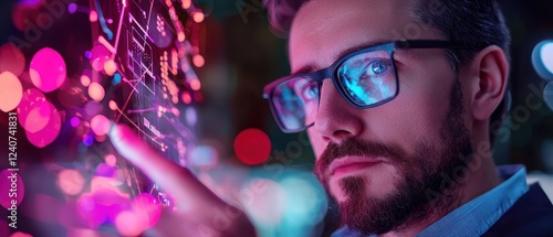 A focused individual analyzes digital data with colorful light reflections, showcasing a blend of technology and creativity.