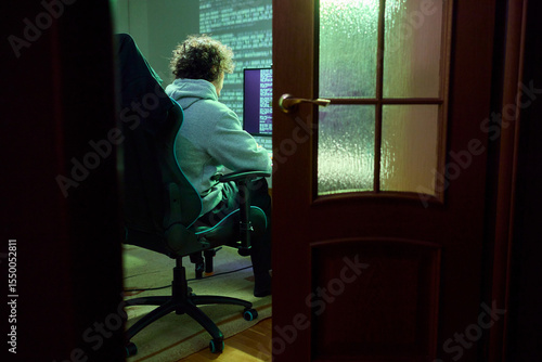A Focused Individual is Working Late at a Computer in a Dimly Lit Room During Night Hours