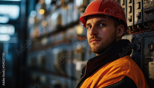 A focused industrial worker stands near control panels, wearing a bright orange jacket and hard hat. The environment is well-lit, highlighting his concentration on the tasks ahead