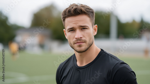A focused male soccer player preparing on a field with intensity, soccer training, athletic focus, sports dedication, soccer field, young athlete