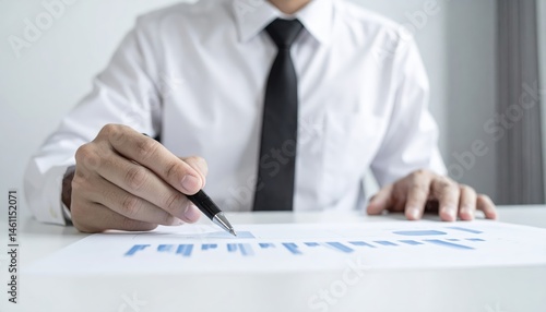 A focused man in a crisp white shirt and a neatly knotted tie sits at a desk, diligently writing notes on a sheet of paper with a pen.