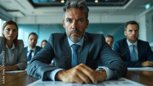 A focused man in an office suit sits at a conference table in a modern office. A businessman negotiates in a meeting room. Business concept.