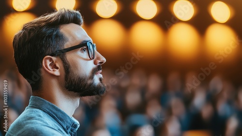 A focused man in glasses attends an event, illuminated by warm lights, surrounded by a blurred audience, deep in thought or contemplation.