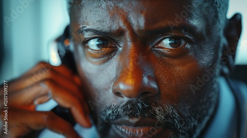 A focused man on the phone, showcasing intense emotions and deep concentration.