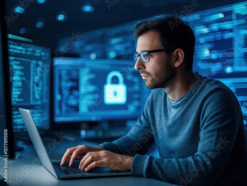 A focused man working on a laptop with cybersecurity lock symbols on multiple screens in a dark tech environment.