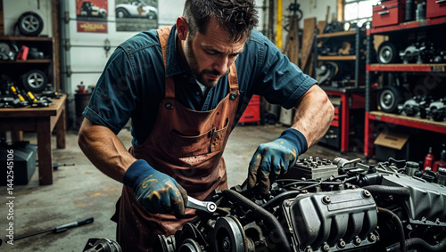 A focused mechanic repairs an engine in a workshop with careful attention and skill.