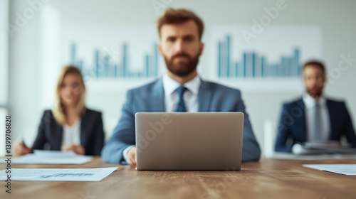 A focused meeting scene with professionals discussing data, featuring a man at a laptop and colleagues reviewing documents.