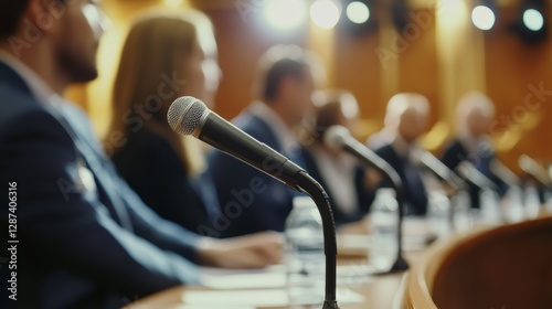 A focused panel discussion featuring microphones and participants engaged in conversation, highlighting a formal setting.
