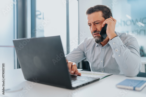 A focused professional multitasking with laptop and phone in a bright, contemporary office setting.