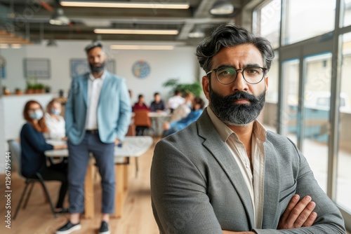 A focused professional stands confidently in the foreground, while colleagues engage in discussions in a modern office environment.