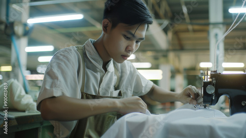 A focused tailor carefully stitching fabric on a sewing machine in a well-lit workshop, showcasing craftsmanship and attention to detail.