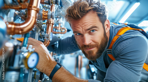 A focused technician adjusts various pipes and connections in a contemporary industrial environment during maintenance tasks to ensure efficiency and safety