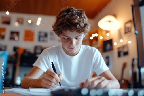 A focused teenager diligently writes in a notebook at a stylish desk adorned with photos, showcasing a moment of concentration in a creatively inspiring environment.