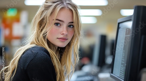 A focused woman diligently works on a keyboard for an office project.