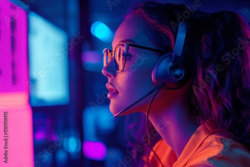 A focused woman in a headset engages with technology. The vibrant colors create a dynamic atmosphere. She exemplifies modern communication. Generative AI