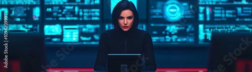 A focused woman in a high-tech control room analyzing data on multiple screens.