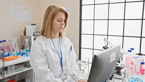 A focused woman scientist in a white lab coat using a computer in a laboratory setting filled with scientific equipment.