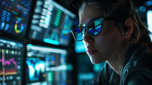 A focused woman with glasses closely analyzes data displayed on multiple screens, reflecting a deep engagement with technology and analytics.