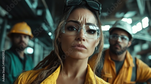 A focused woman with safety goggles and work attire is the center of attention in a construction environment, showcasing determination and professionalism in her field.