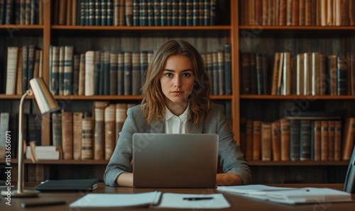 A focused woman working on a laptop in a library setting.