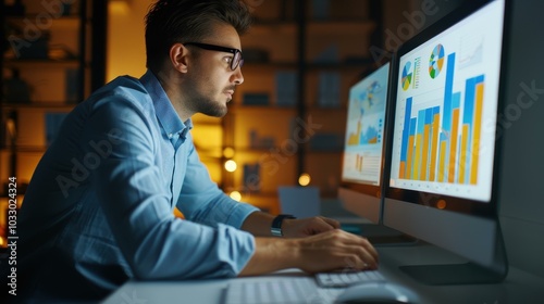 A focused young male project manager develops a marketing strategy, working diligently at his desk in a vibrant office.