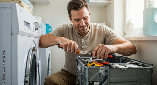 A focused young man is working hard on a washing machine in a bathroom.