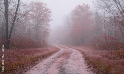 A foggy forest road with trees in the background