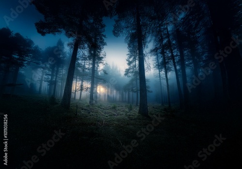 A foggy forest with tall trees, the sun shines through the trees in the distance.