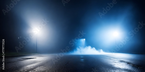 A foggy night on a street illuminated by street lights, creating a mysterious atmosphere