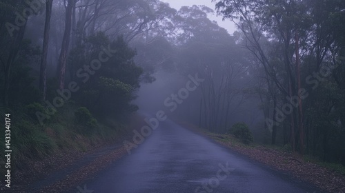 A foggy road winds through a dense and misty forest landscape