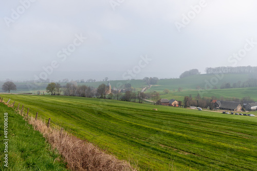 A foggy spring landscape with a view over the meadows and rollings hills on the border between the Netherlands and Belgium.