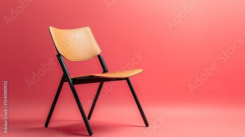 A folding guest chair with a sleek black frame and tan leather seat, positioned on a coral pink backdrop.