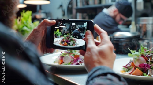 A food blogger taking photos of a beautifully plated dish in a restaurant