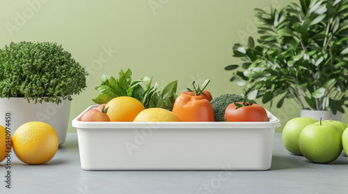 A food container box mockup showcasing fruits and vegetables with empty space for branding or graphic customization