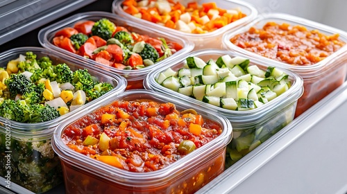 A food safety concept featuring colorful meal prep containers filled with healthy vegetables and sauces, organized in a refrigerator.