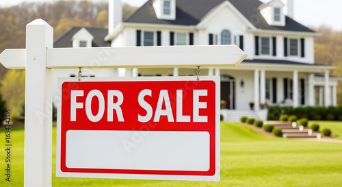 A For Sale sign sits prominently in front of a beautiful twostory home with lush greenery