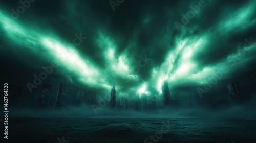 A foreboding scene of a dark, stormy city skyline with dramatic green clouds overhead, capturing a sense of tension and fear in an apocalyptic urban landscape.