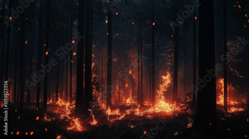 A forest engulfed in flames under the night sky, capturing the intense heat and destruction of a wildfire with glowing embers and thick smoke.